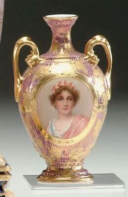 Bearing Vienna mark. Of baluster form with gilt scrolling foliate handles, centrally painted with a medallion portrait of a young girl in a red and white headdress against a violet lustre field enriched in gilding. H: 7 3/4 in.