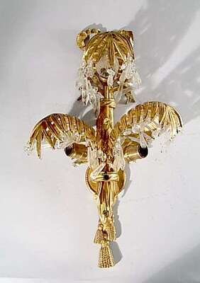 Formed as a hanging ribbon suspending tassels and three palmettes, each fitted with faceted crystal drops. H: 23 in.