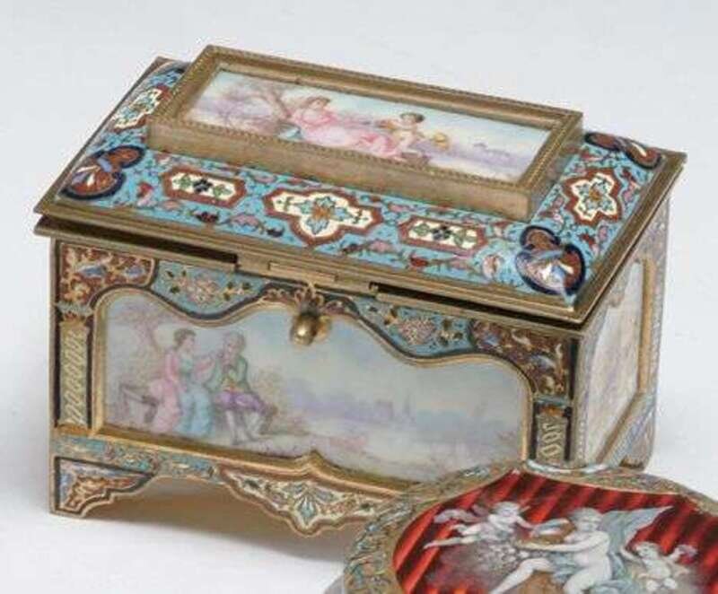 Porcelain signed "Duk," the sides and cover fitted with porcelain plaques painted with figures and landscape scenes, the whole supported on bracket feet. H: 5, L: 6 in.