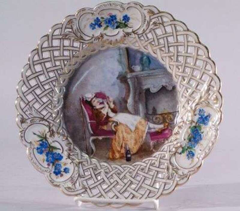 Underglaze blue crossed swords mark, each centrally painted in colors with a genre scene within a latticework border with flower-decorated cartouches, the whole enriched in gilding. Dia: 9 1/4 in.