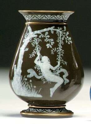 Probably English, possibly George Jones, of flattened baluster form, and decorated with the figure of a girl seated in a garlanded tree swing, against a deep green ground. H: 10 1/4 in.