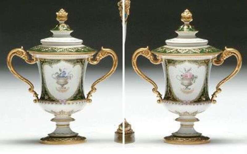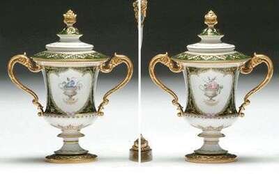 Printed mark, year cipher for 1911. Of campana shape with scrolling handles finely painted with flowers in reserve against a dark green ground, the whole enriched in gilding. H: 10 3/4 in.