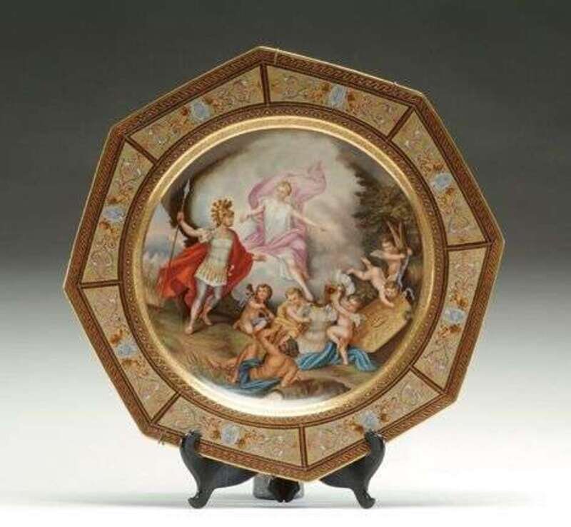 Bearing Vienna mark, centrally painted with a scene of classical gods and goddesses within a paneled border with Berain-esque decoration, blue beehive mark.