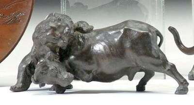 Depicting a bear attacking a bull. Signature to underside. H: 4 3/4, L: 10 in.