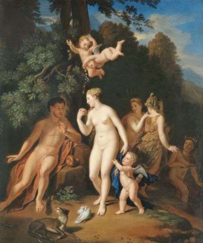 Depicting the Judgment of Paris, impressed KPM and scepter mark. H: 14 , W: 11 1/2 in.