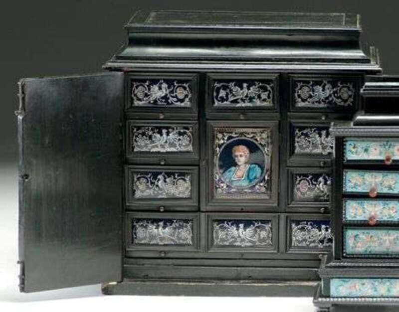 The ogee molded top sliding to reveal a red lacquer interior, the two metal bound panel doors, opening to reveal an arrangement of ten drawers and one cupboard each set with an enamel panel decorated with exotic birds and foliate scrolls, centered by a female bust, raised on a plinth base, center panel bears monogram. H: 16 1/2 in, W: 16 3/4 in, D: 11 in.