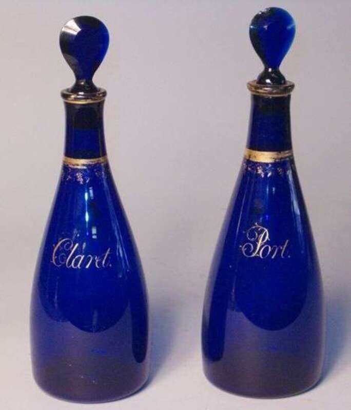 In the manner of William Absolon, Yarmouth, the necks decorated with fruiting vines, the bodies inscribed "Port" & "Claret" and monogrammed. H: 12 1/4 in.