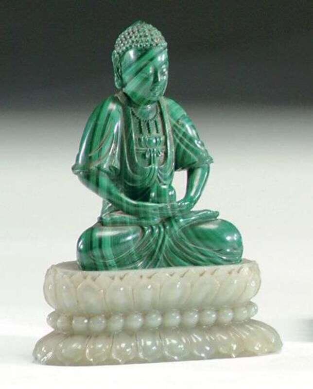 CHINESE MALACHITE FIGURE OF AMITAYUS ON A JADE LOTUS STAND