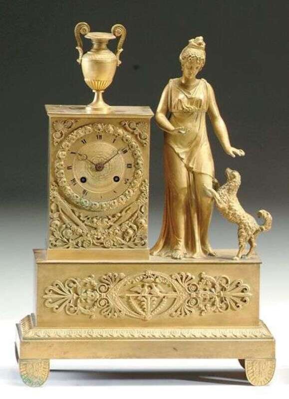 The round dial set within a rectangular case surmounted by an urn and flanked by the figure of a woman in Empire dress patting a dog above a rectangular plinth base supported on anthemion feet. H: 16 1/4 in.