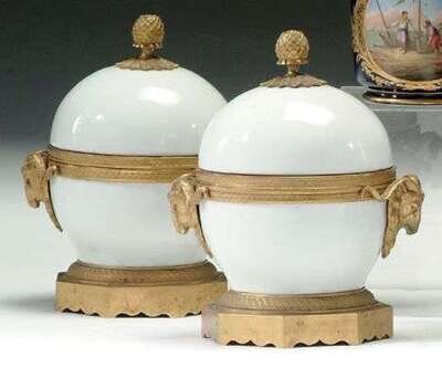 The white porcelain bodies surmounted by acorn finials and with twin ram's-mask handles, raised on octagonal bases. H: 8 1/2 in.