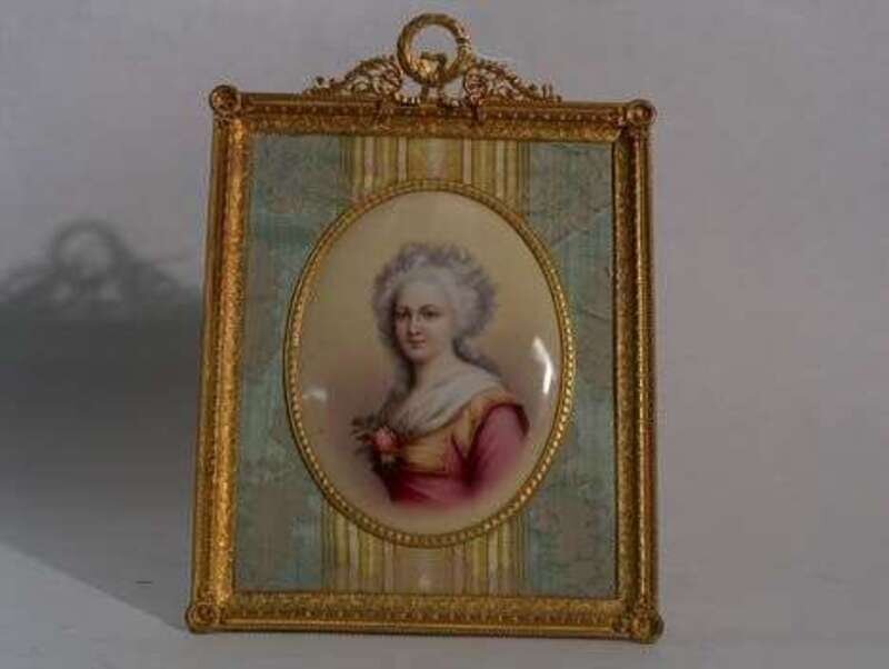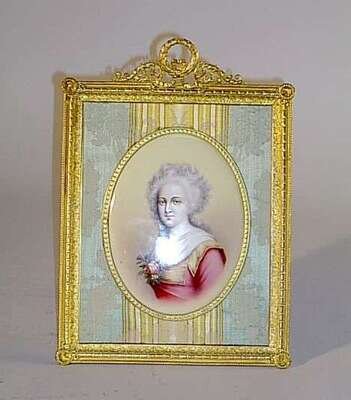 Painted with the image of an 18th century-style woman, possibly Madame Elisabeth de France, in a Louis XVI-style silk and gilt metal frame. H: 6 1/2, W: 4 3/4 in.