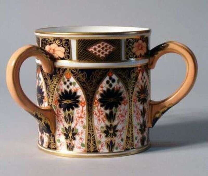 Painted red Stevenson and Hancock mark, richly painted and gilded in the Imari pattern, together with a miniature Derby vase in the Imari pattern , 19th c., H: 3 in., and a Derby Imari pattern loving cup, late 19th c. H: 4-5 1/2 in.