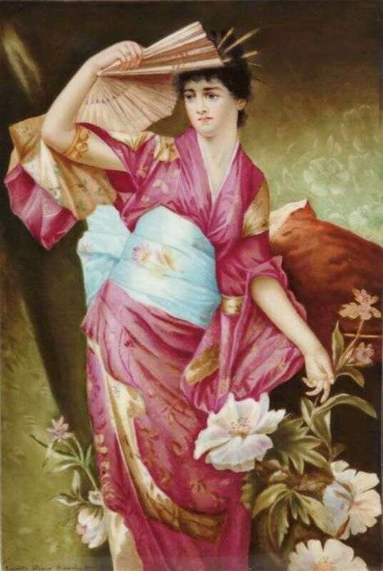 Impressed mark, signed indistinctly and dated 1902. Depicting a woman in Japanese dress holding a fan. H: 9 1/4, W: 6 1/4 in.