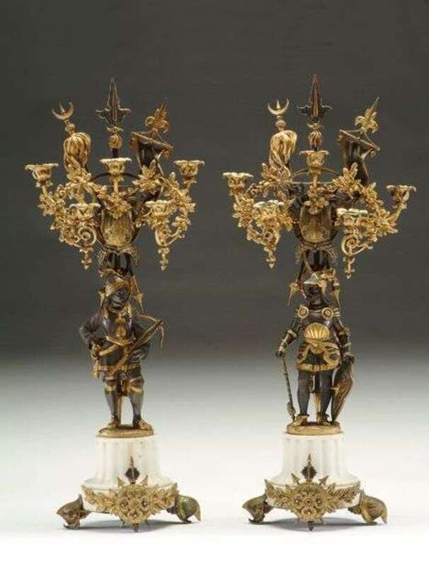 The figural stems modeled as knight, surmounted by naturalistic branches, chest armor and three lances, raised on fluted white marble bases and helmet form feet. H: 28 1/2 in.