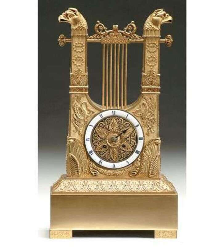 The round dial with enamel chapter ring set within an elaborate lyre-form case surmounted by falcons' heads, the whole supported on a rectangular base. H: 20 1/2, L: 11 1/4 in.