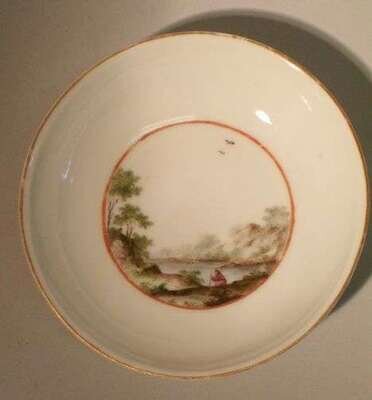 Probably Bow, with later decoration. Each painted with a figure in a lakeside landscape. Saucer, Dia: 4 in.