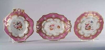 Probably Rockingham. Each piece centrally painted with flowers within a pink and gilt border. Comprising: four serving dishes and 11 plates, Dia: 9 1/4.