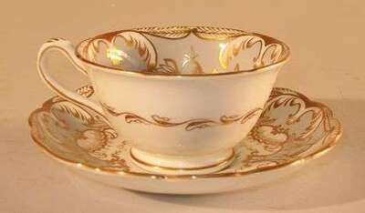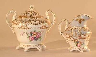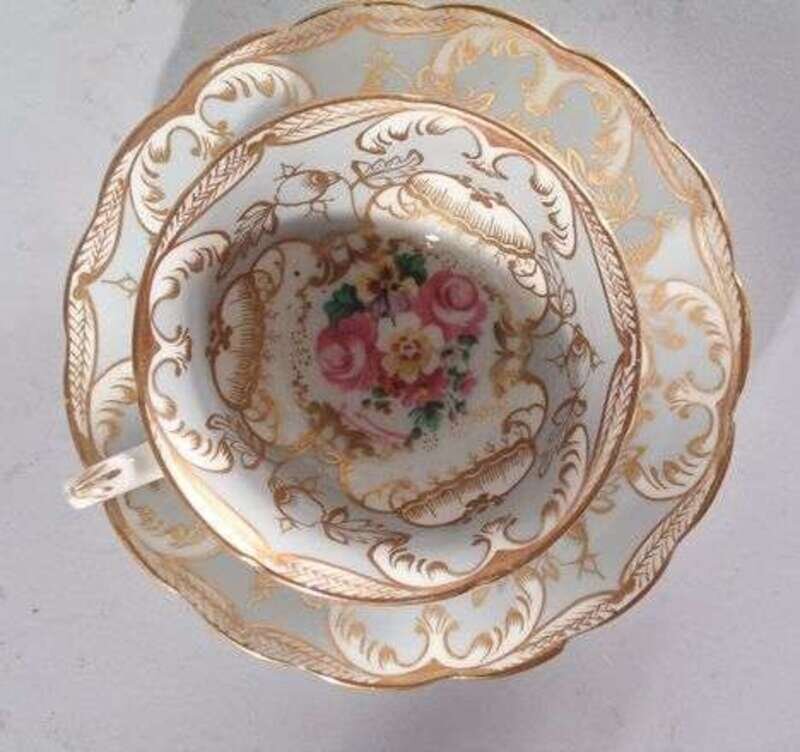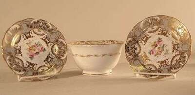 Jackson & Gosling, England. Each piece decorated with flowers within a pale blue and gilt border. Comprising a teapot, creamer, sugar, waste bowl, twelve plates Dia: 6 1/8 in., ten cups and ten saucers.