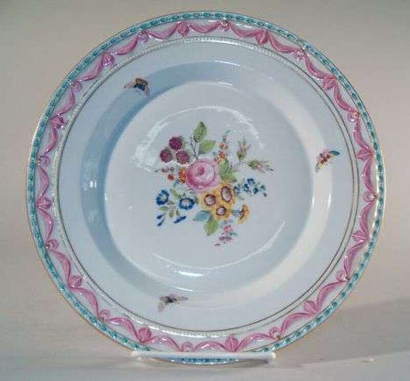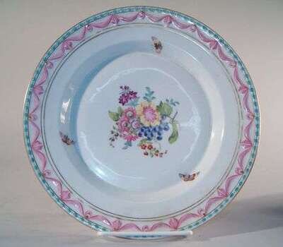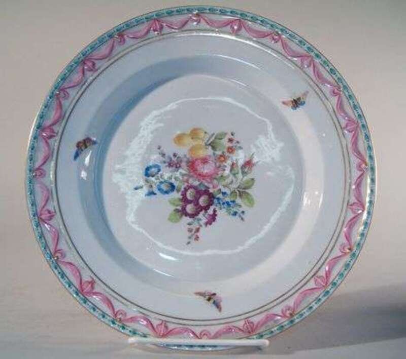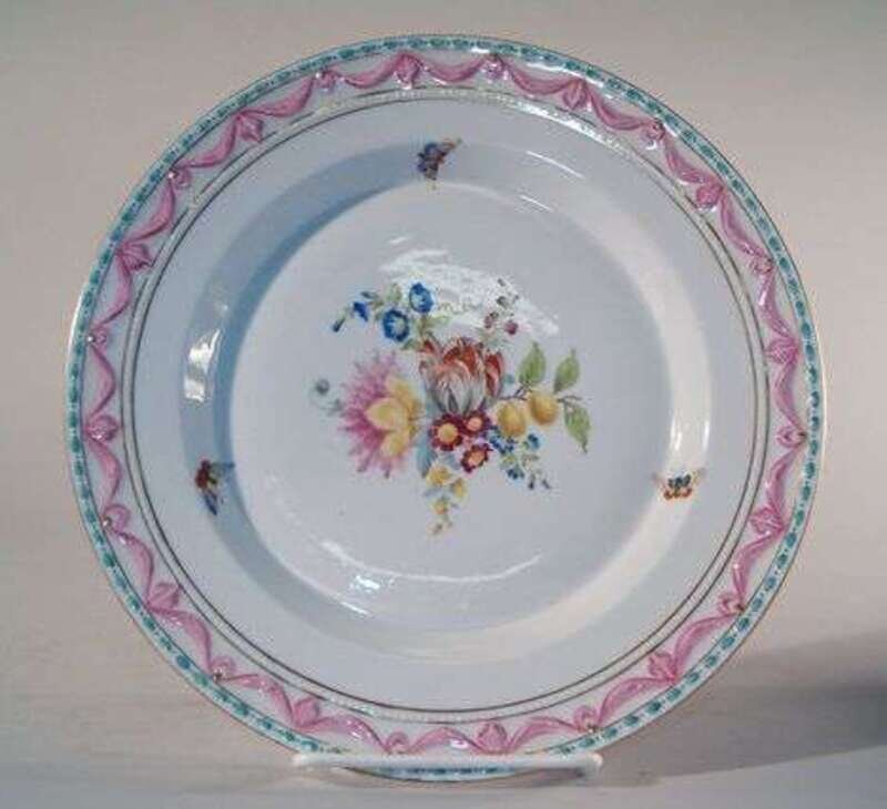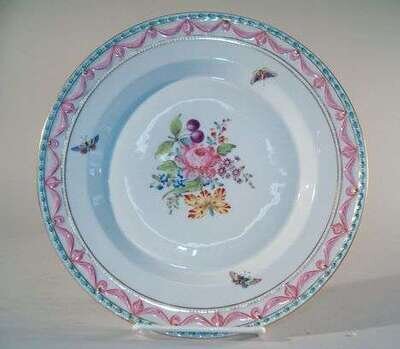 Centrally painted with flowers and butterflies on a white ground within a border of swags and beading. D: 9 1/2 in.