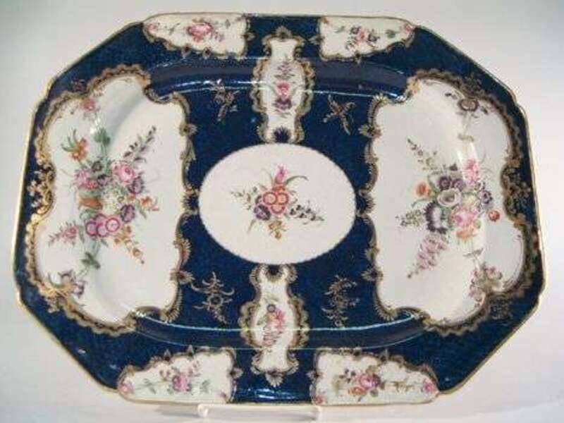 Underglaze mark, fretted square mark. Finely painted in colors with flower sprays in gilt-bordered reserves on a blue scale ground. L: 17 in.