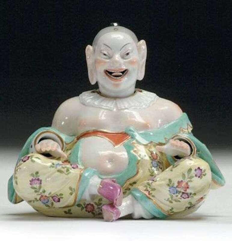 Modeled seated with crossed legs in green lined yellow flower painted robe. The head, tongue, and hands pivoted to rock rhythmically, blue underglaze cross sword mark. H: 10 in.