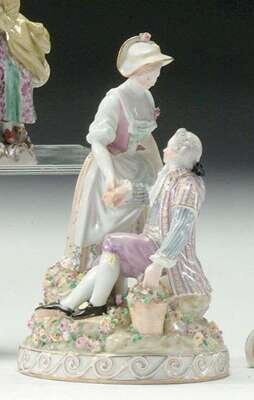 Depicting gallant and his companion in brightly colored 18th century costume, on a flower-encrusted base, blue underglazed cross sword mark. H: 7 3/4 in.