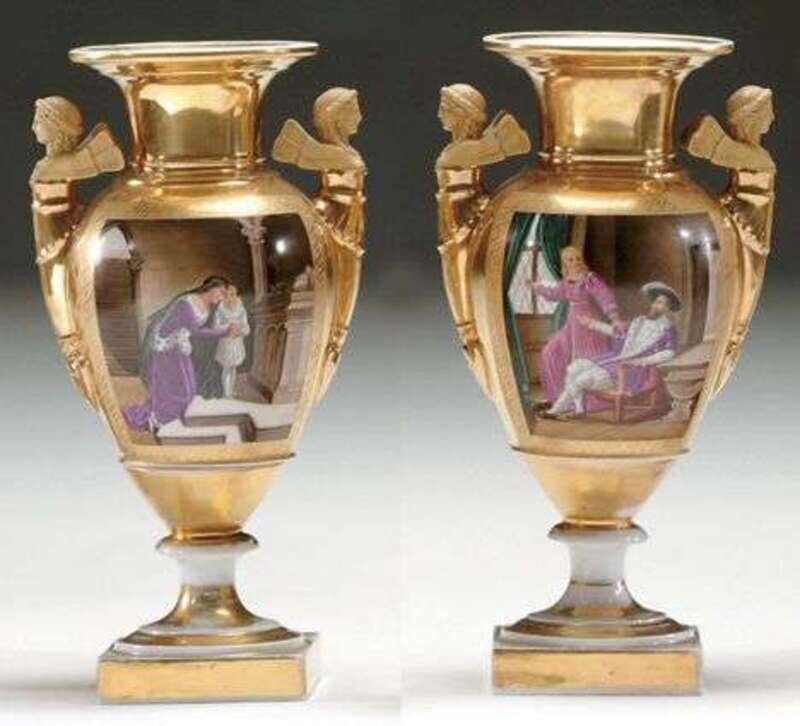 Each of classical urn form with caryatid handles and finely painted in colors with scenes of Francis I of France and his mistress and of the child Louis IX with his mother before his father's tomb, in reserves against a gold ground. H: 14 in.