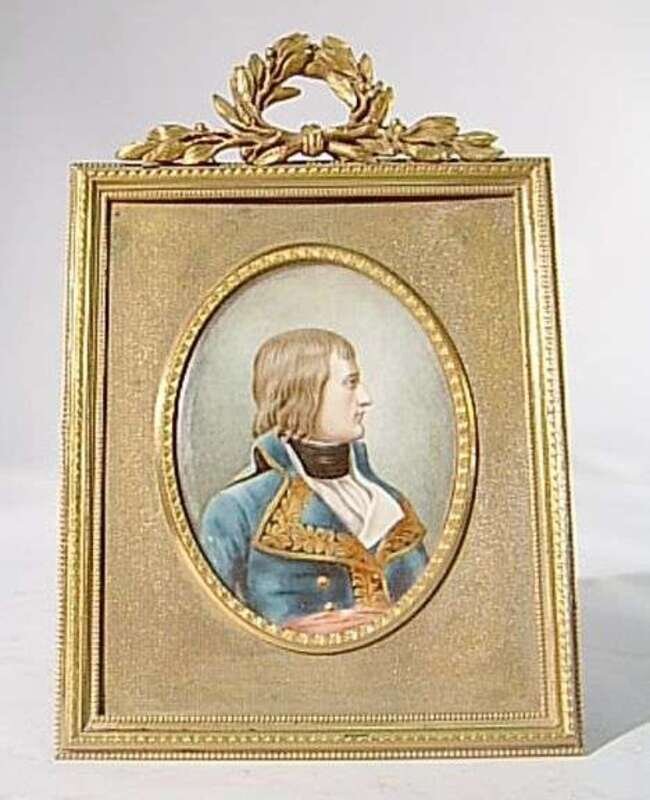 Oval, and depicting the young Napoleon in his uniform as a general, mounted in a gilt metal frame. H: 2 3/4 in., W: 2 1/8 in.