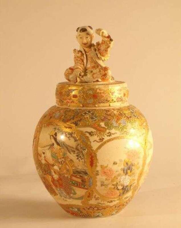 The lid surmounted by a man wearing a brightly colored robe, with ovoid sides and polychrome, gilt enhanced decoration depicting figures and foliage, gilt painted signature. H: 10 in.