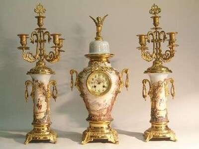 FRENCH PORCELAIN & GILT-METAL-MOUNTED CLOCK GARNITURE