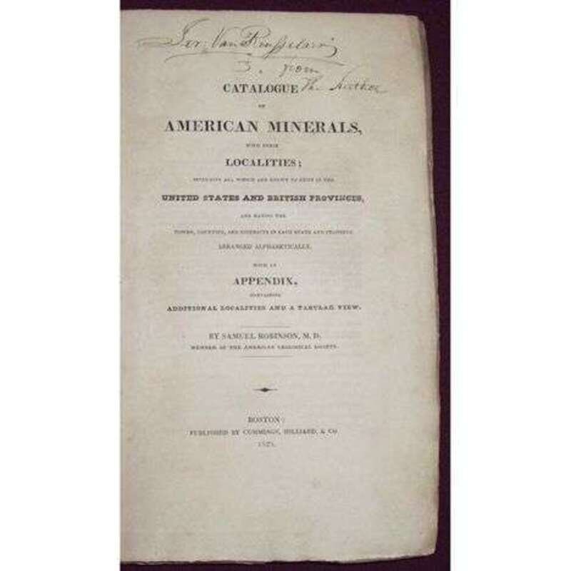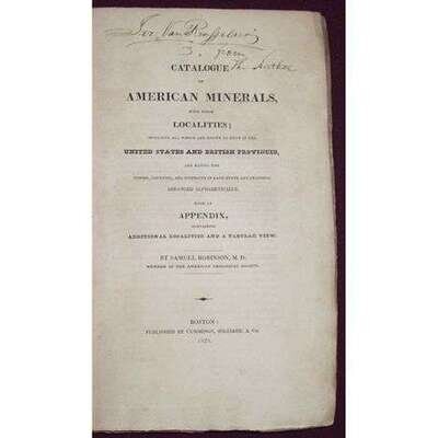 Robinson, Samuel. A Catalogue of American Minerals. Boston: Cummings, Hilliard, 1825. First edition. 8vo, orig. bds., paper spine label; spine chipped - head & foot chipped away, front joint chipped, light dust soiling & minor dampstaining to bds. Light foxing to endpapers. Uncut. Inscribed & signed by "the author" on head of title page.