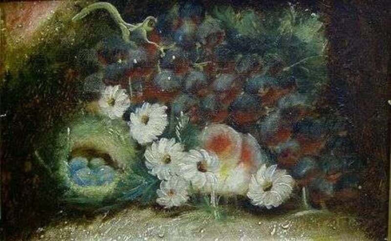 GRAPES, FLOWERS, ROBIN'S NEST AND PEACH IN A LANDSCAPE