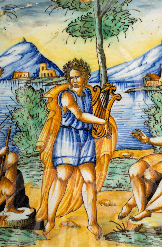depicting Apollo as victor of the musical contest over Pan and Marsyas; unmarked.