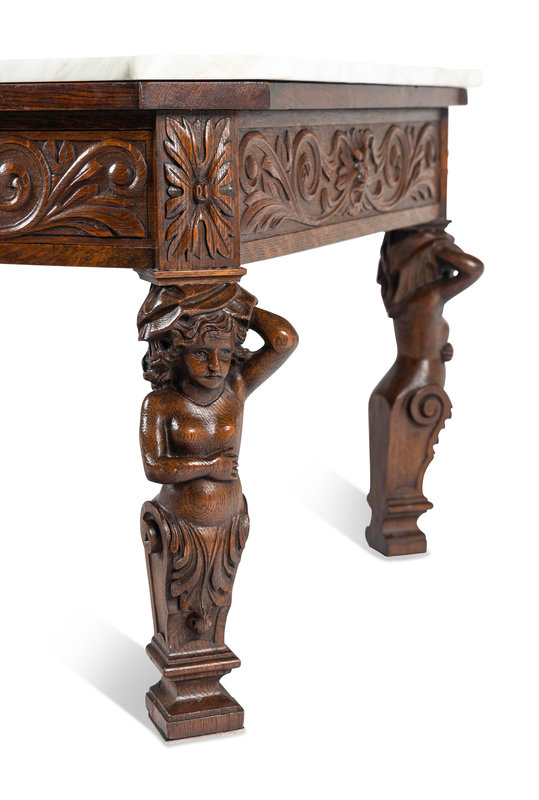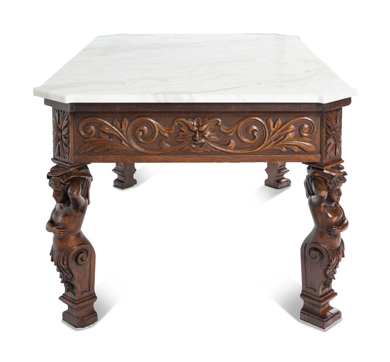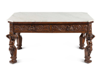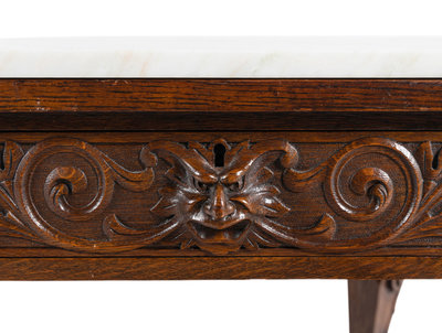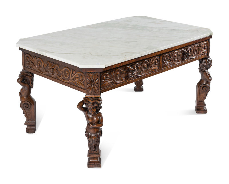 A Renaissance Style Carved Oak Marble-Top Low Table