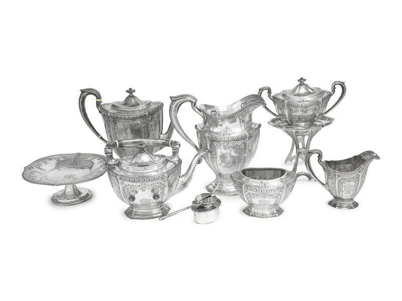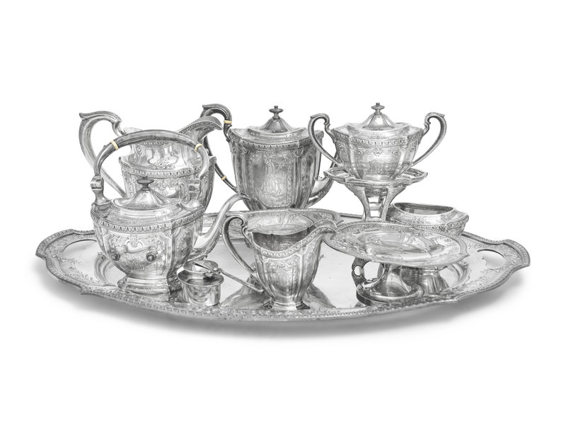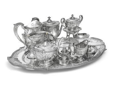 Dolly Madison pattern, comprising a hot water kettle on stand, teapot, coffee pot, covered sugar, creamer and tray.