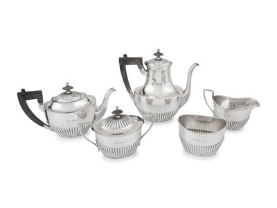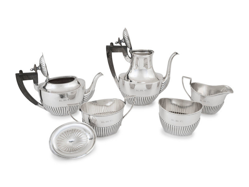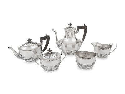 comprising a teapot, coffee pot, creamer, covered sugar and waste bowl.