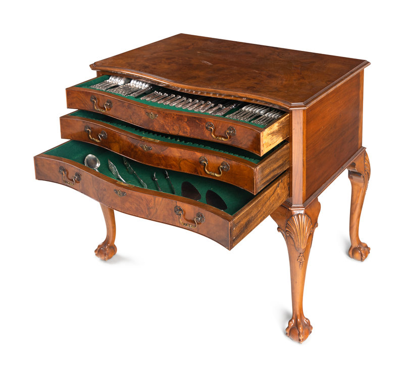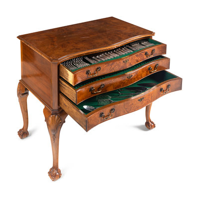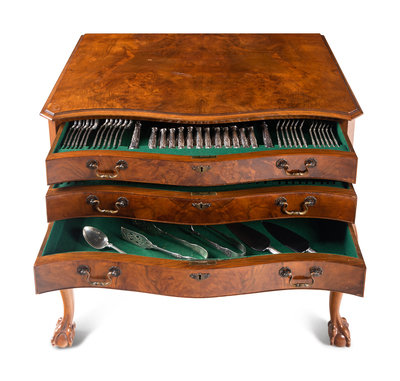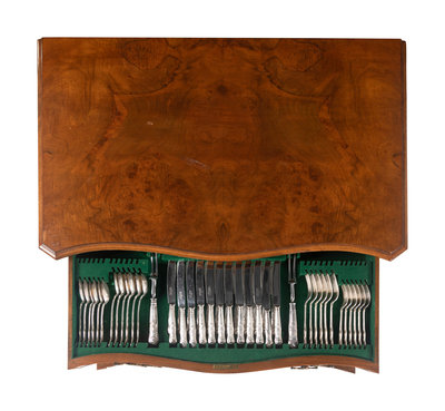 A Cooper Brothers Silver Flatware Service in a Fitted Burl Walnut Chest