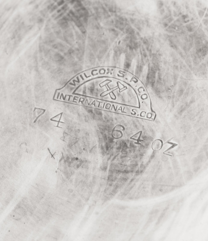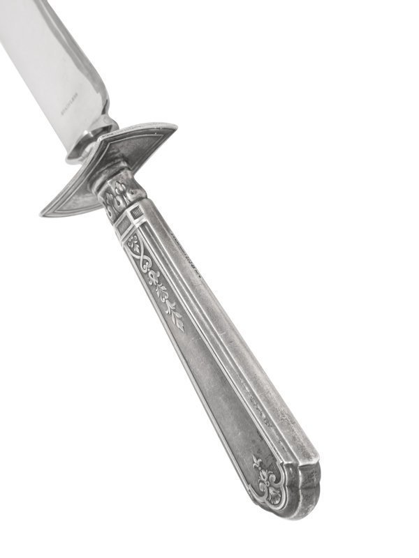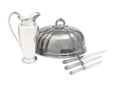 together with a three-piece silver-handled carving set and a silver-plate water pitcher; 5 items total.