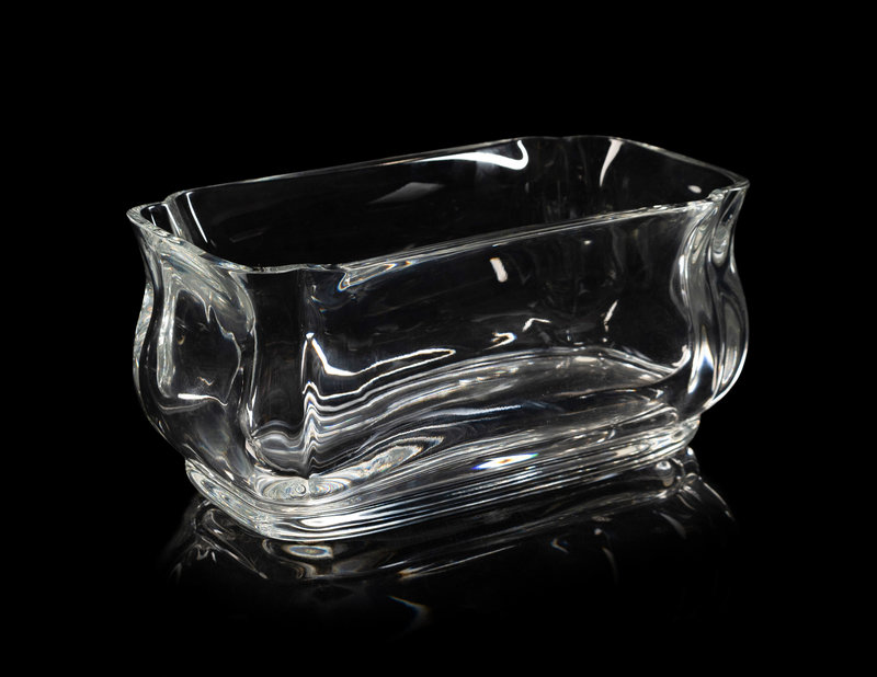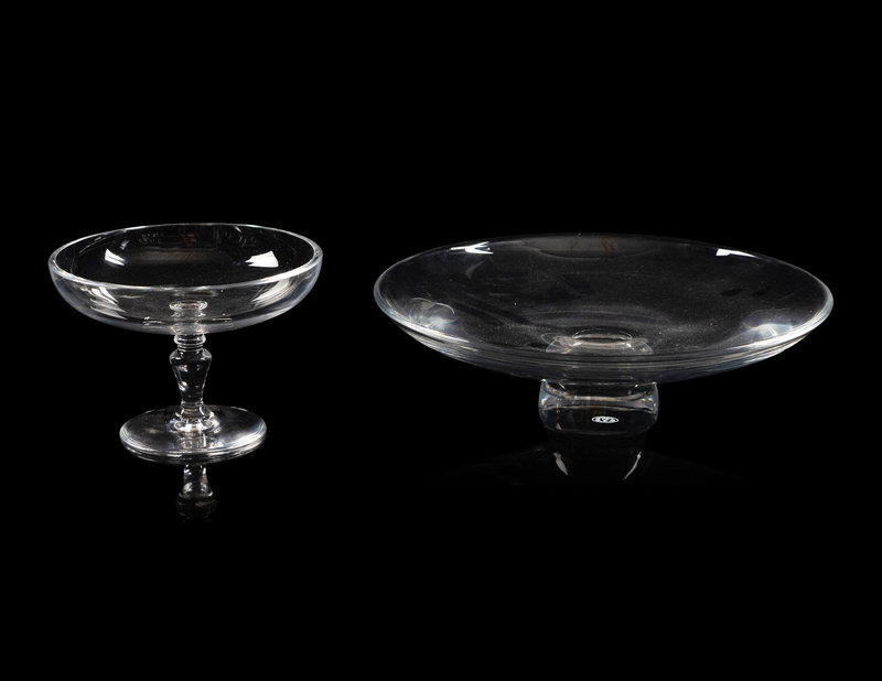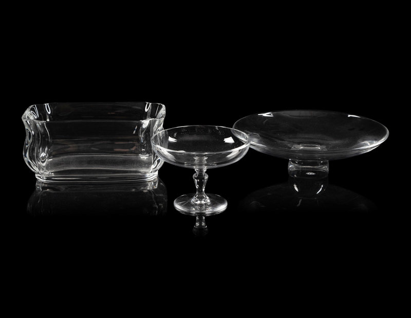 comprising a rectangular low vase or jardinière, a footed dish and a cake stand, each with acid-etched mark to the underside.