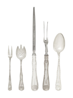 with engraved script monogram 'D' to the handles, comprising: