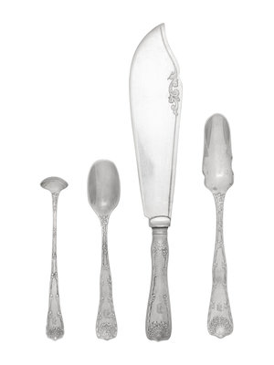 with engraved script monogram 'D' to the handles, comprising: