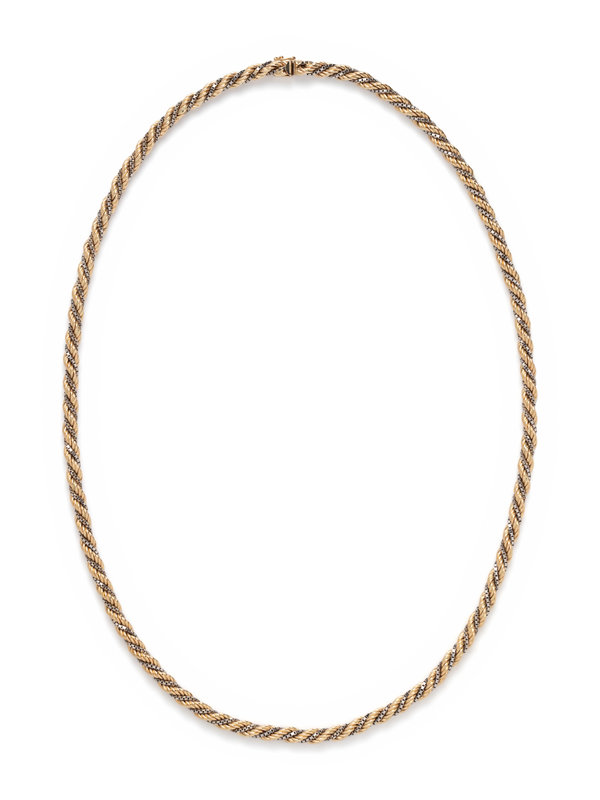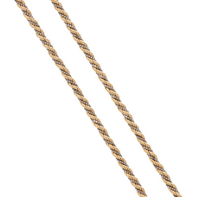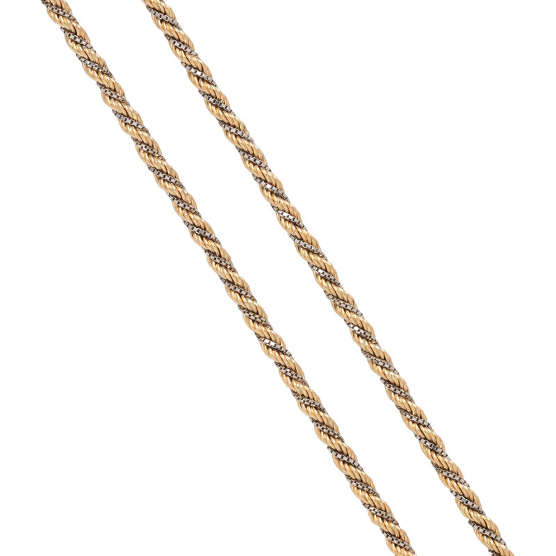 Consisting of a yellow gold rope link chain intertwined with a white gold box link chain. 30 inches long.