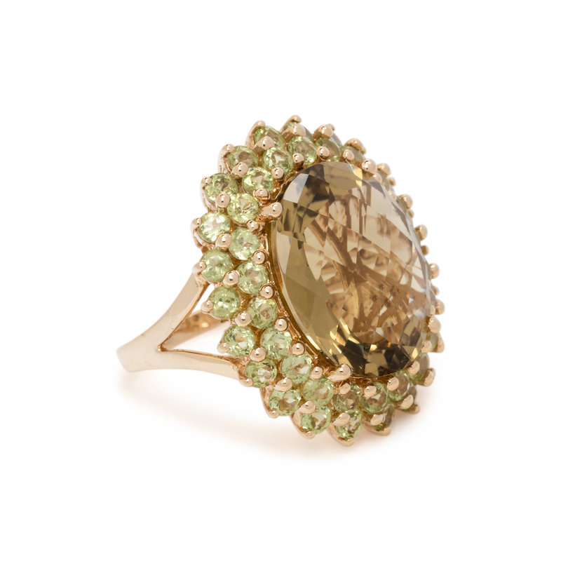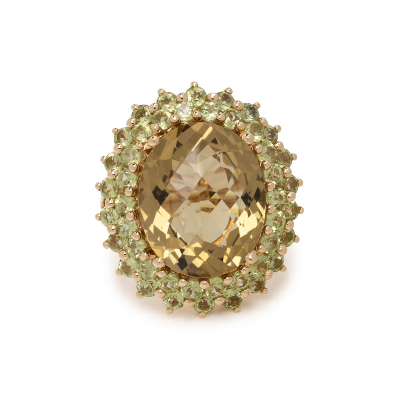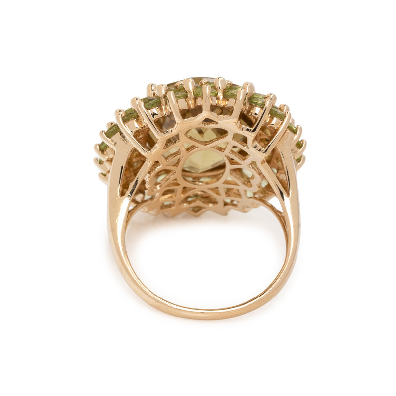 Containing one oval checkerboard cut citrine measuring approximately 17.15 x 14.10 mm and 44 round mixed cut prasiolites. Mounted in yellow gold. Ring size 7.