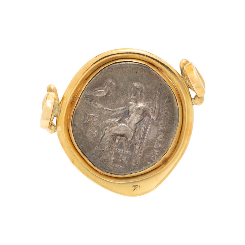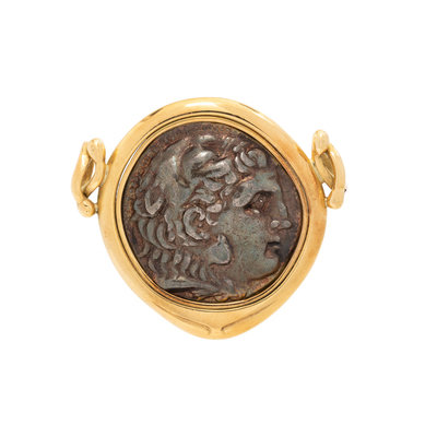 Consisting of a coin depicting Alexander the Great. Mounted in yellow gold. 1 1/2 inches long.