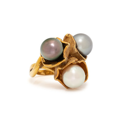 Containing one grey pearl, one black pearl and one white pearl measuring approximately 10.30 mm. Ring size 6 1/2.
