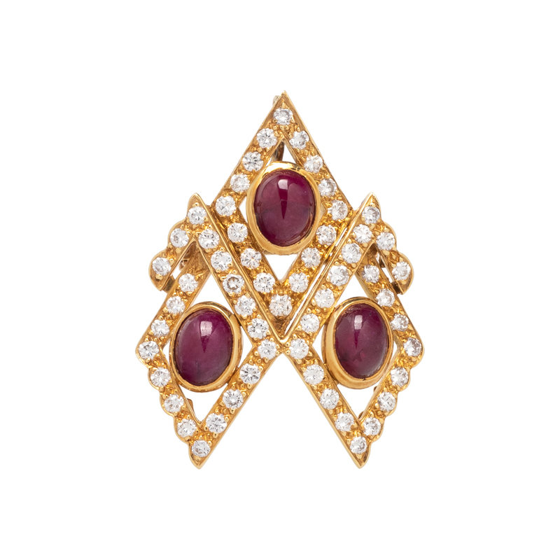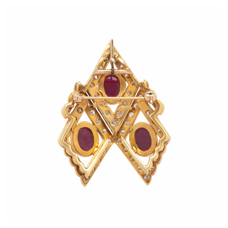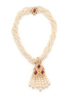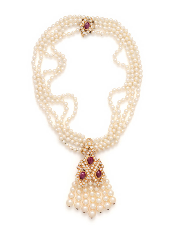 Consisting of four strands of pearls measuring approximately 4.50 mm, suspending a removable tassel pendant/brooch containing seven pearl tassels, the clasp and brooch containing four oval cabochon rubies and 81 round brilliant cut diamonds weighing approximately 4.00 carats total. Mounted in yellow gold. Necklace: 16 inches long. Pendant/brooch: 3 inches long.