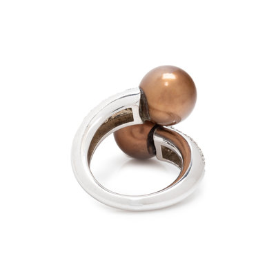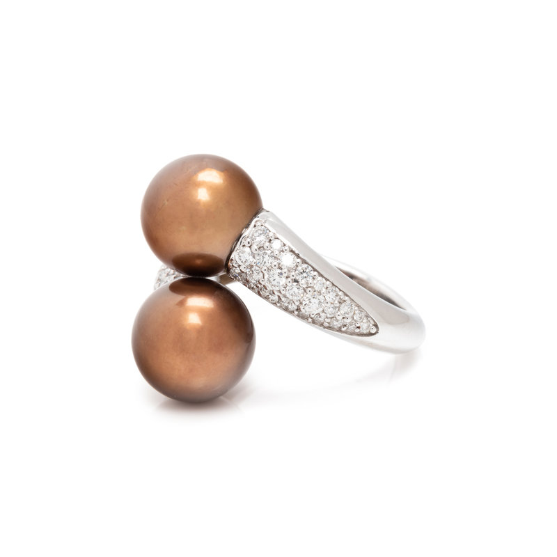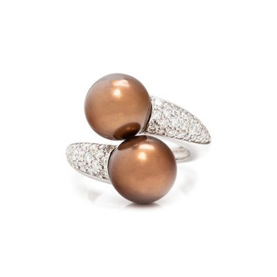 Containing two brown pearls measuring approximately 11.30 mm in diameter and 48 round brilliant cut diamonds weighing approximately 0.80 carat total. Mounted in white gold. Ring size 7.