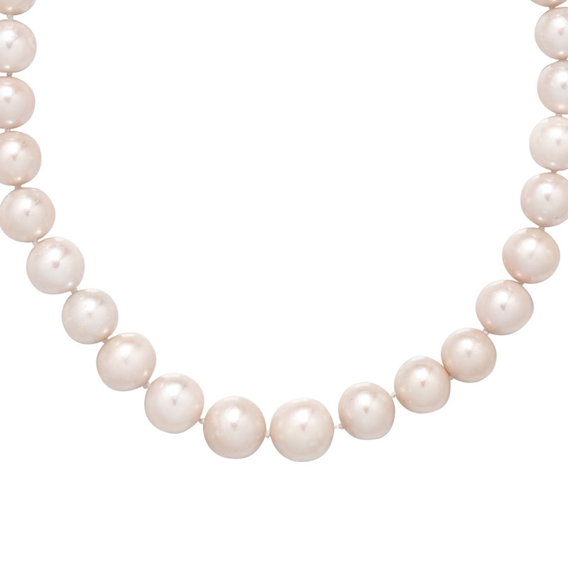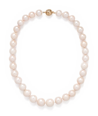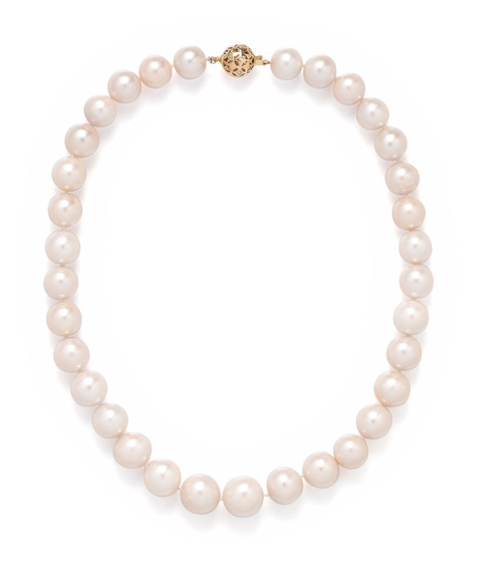 Consisting of cultured pearls measuring approximately 11.70-14.80 mm in diameter, strung knotted with yellow gold clasp containing seven round brilliant cut diamonds. 17 1/2 inches long.