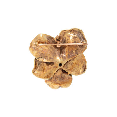 Consisting of matte polychrome enamel petals containing one round brilliant cut diamond. Mounted in yellow gold. 1 1/4 x 1 1/4 inches.