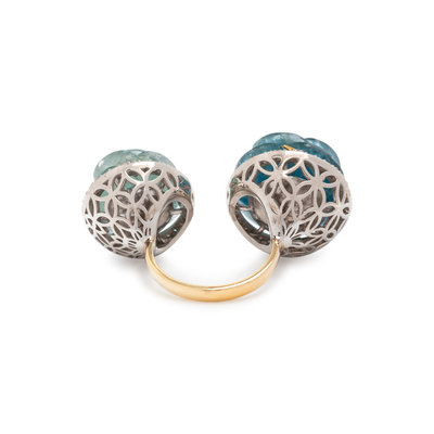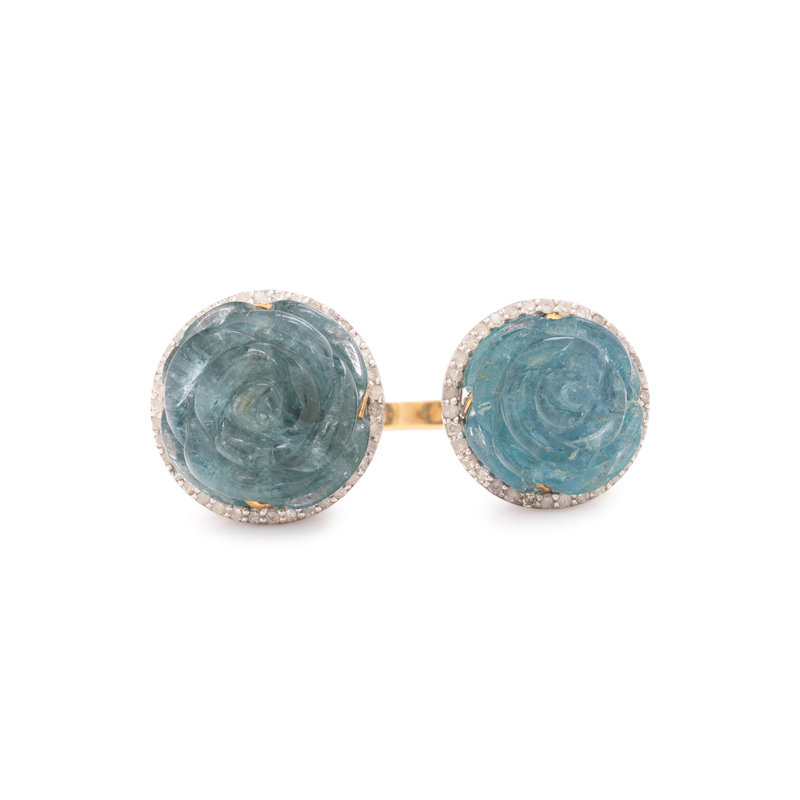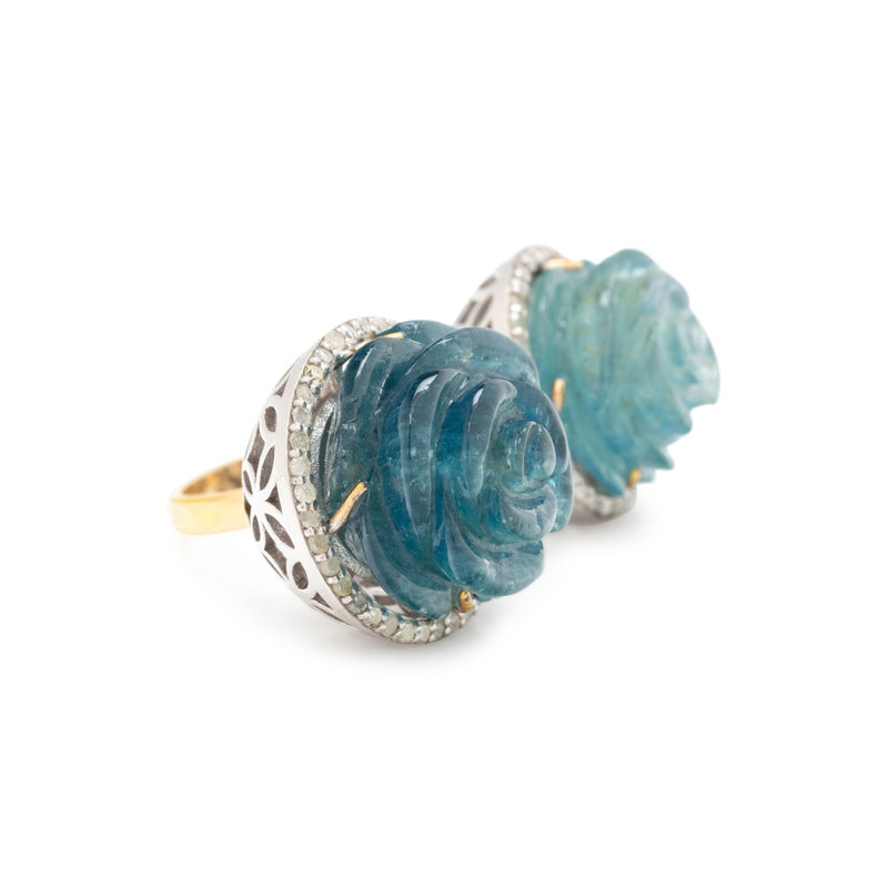 Containing two carved aquamarine roses measuring approximately 15.00 mm and 13.00 mm wide and numerous single cut diamonds. Mounted in yellow gold and silver. Ring size 7.